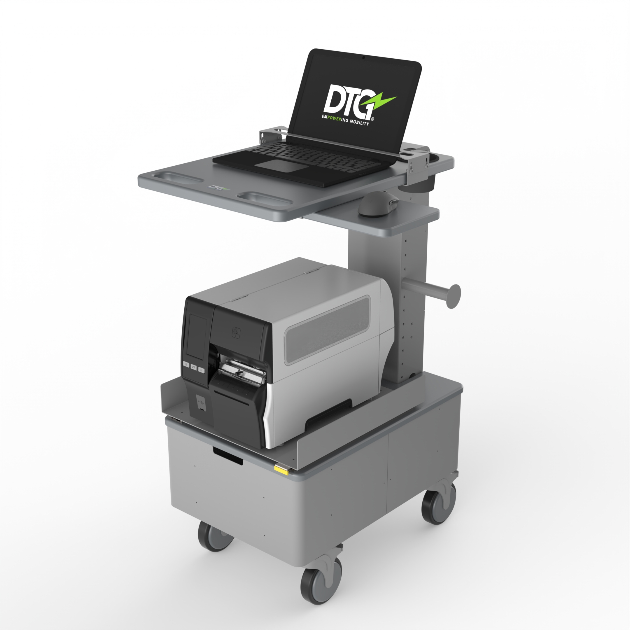 Mobile workstation powered by two 300 Wh LFP batteries and DTG's patented Uninterruptible Power System (UPS). This innovative solution is designed to support a laptop computer, small thermal printer, document printer and barcode scanner.